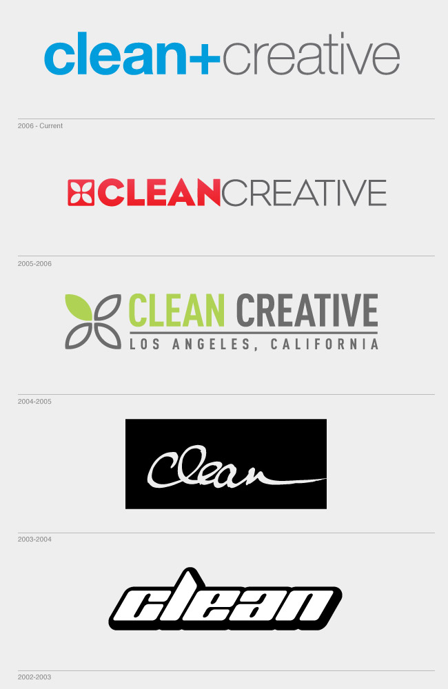Multiple variations of the Clean Creative identity over the years (the red one being the most current).
